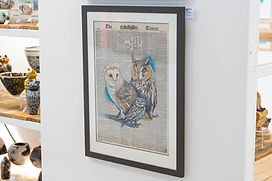 Rhian is an artist and illustrator who works from her home studio in Paignton on the South Devon coast. In a previous life she was a graphic designer and typographer. She realised that she had neglected her childhood love of drawing, painting, and colour, so began to experiment, finding her artist voice and her own quirky style. Creating lively and colourful mixed media illustrations, Rhian repurposes old books and maps as both the backgrounds and the inspiration for her work, with a nod towards her design career. Her challenge is always to find an unexpected interpretation between word and image. Drawn by hand, then coloured with ink, gouache paint and pastel, Rhian uses traditional techniques and usually adds a sprinkle of wit or humour with hand stamped lettering. Rhian has built an extensive local following, successfully exhibiting at many Devon galleries, including Delamore Arts, SWAc Open and Torre Abbey. Her distinctive style lends itself to many subjects and themes, but recent involvement as an Accredited UNESCO artist for The English Riviera Geopark, has focussed on local sea life and birds. She recently completed a Masters in Illustration at Falmouth University and is writing and illustrating a children's book about a puffin.