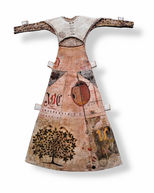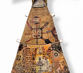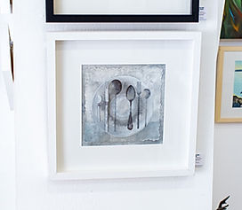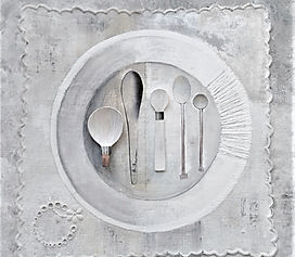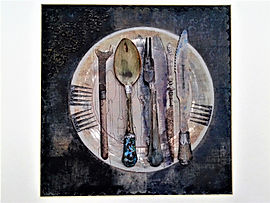 🖌️ Mixed media on 1950's linen napkin The charger plate and napkin is painted in layers of acrylics, crayon and varnish. The actual cutlery varies. It can range from repurposing actual disposable, biodegradable wooden cutlery using a combination of techniques - painting with acrylics, blending printed transfers, printed and 'aged ' montage details to fine machine embroidery and air dried clay. Additional photographic transfers of other implements such as spanners, palette knives, surgical ophthalmic tools can also be superimposed into the composition to aid visual interest and enquiry.