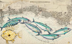 Producing lively and colourful illustrations, the unique quality of Rhian's work is the canvas on which she works, utilising dictionary pages, newspapers and maps to compliment the coastal characters and seaside scenes she brings to life. Whether it's noisy seagulls illustrated on vintage Torbay map sections, a pair of kissing seals on a Brixham harbour nautical chart, or Agatha Christie inspired riddles worthy of the queen of crime herself, Rhian's works are inspired by and pay homage to the Riviera's coastal heritage.