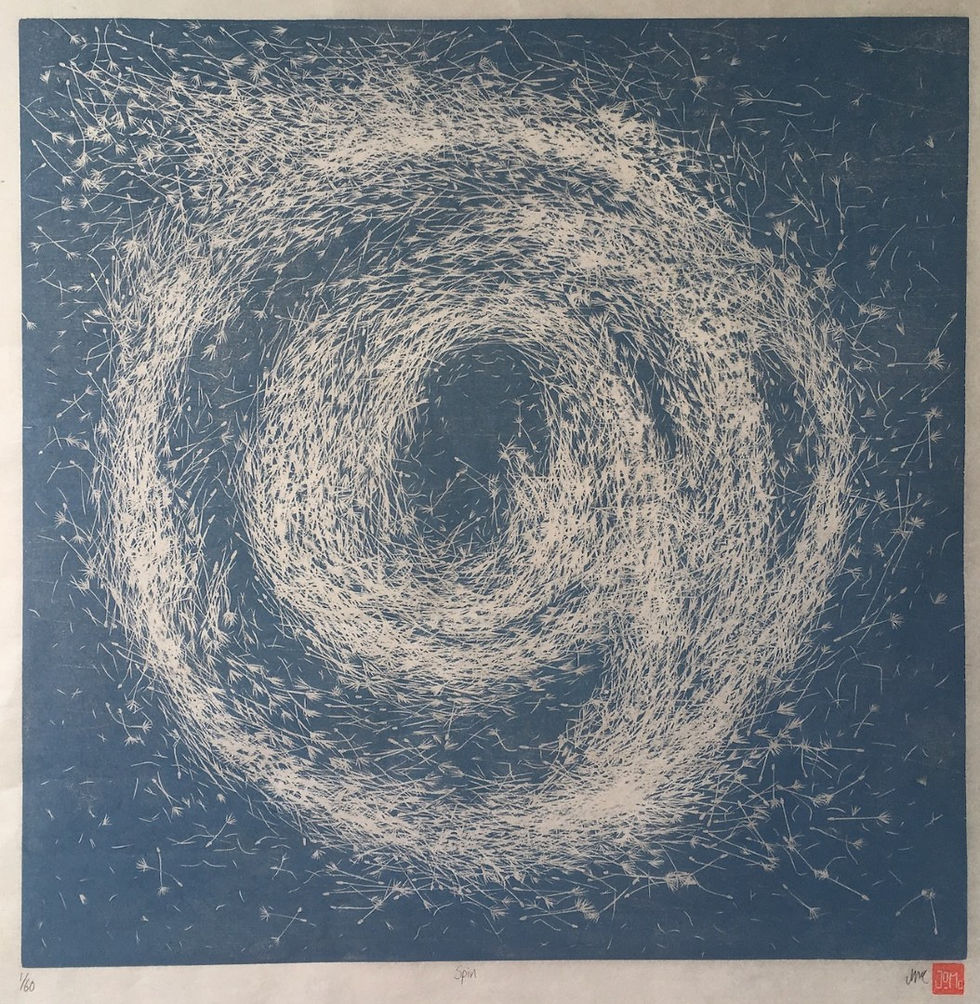 While I also work in paint, oil pastel, collage and watercolour, printmaking is fast becoming my preferred medium. I generally use a reduction lino-printing method, which I approach with a painter's gestural marks.
